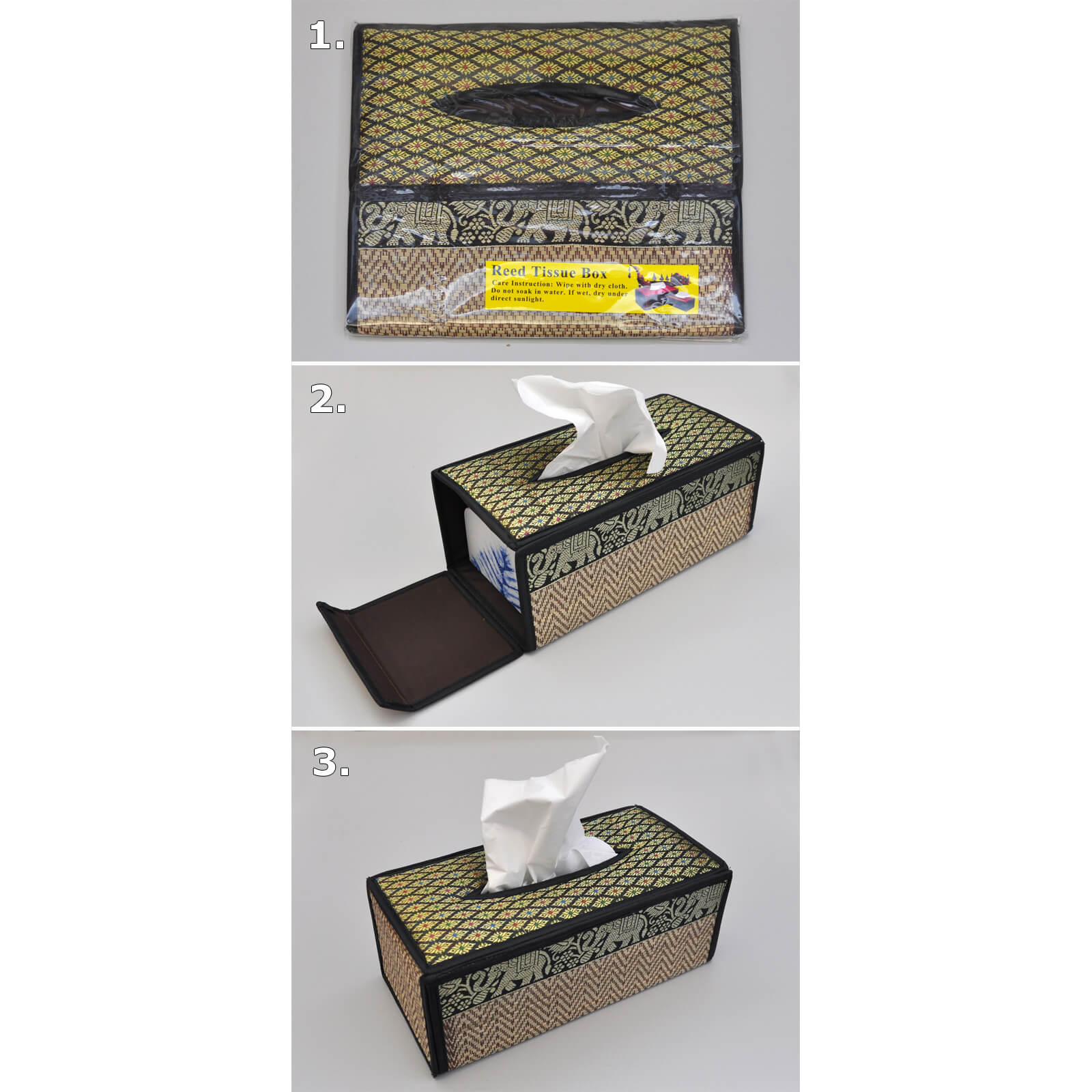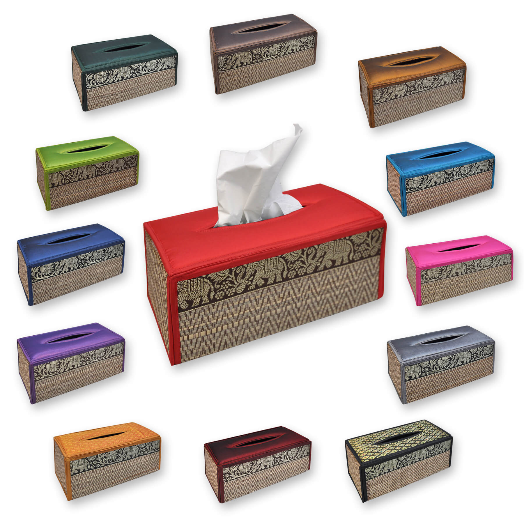 | Eigenschaften: | Diese dekorative Spenderbox für Taschentücher oder Kosmetiktücher ist in Handarbeit in Thailand gefertigt |