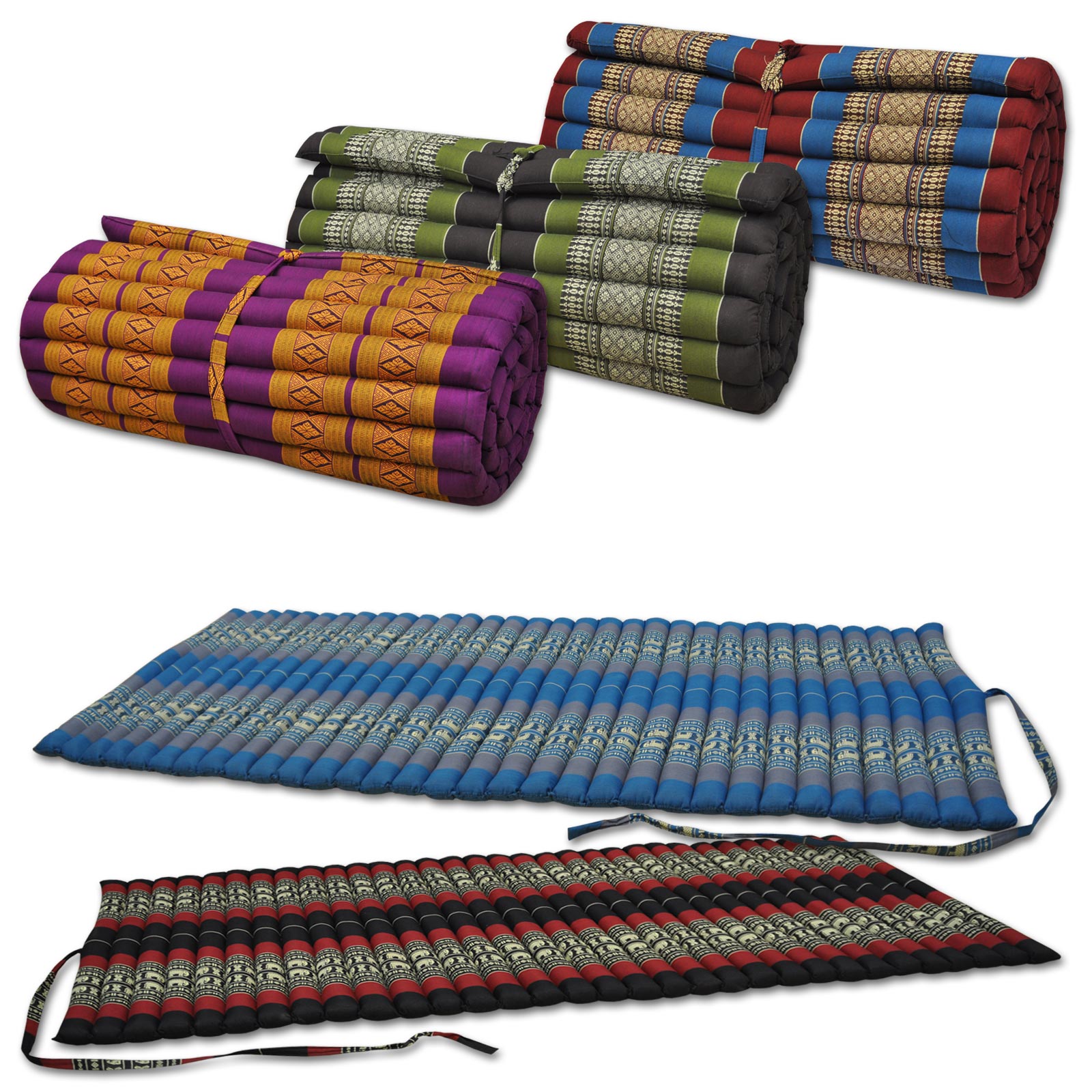 Kapok Rollmatte – Schmale Ausführung für Yoga, Meditation und Entspannung Original thailändische Handwerkskunst Unsere Kapok Rollmatten stammen direkt aus Thailand und sind handgefertigt. Diese authentische Handarbeit garantiert höchste Qualität und ein traditionelles Design, das Ihrem Zuhause einen exotischen Touch verleiht. Atmungsaktive Kapok-Füllung Gefüllt mit Kapok, auch bekannt als Pflanzendaunen, bieten unsere Matten eine hervorragende Wärme- und Feuchtigkeitsregulierung. Diese Füllung macht die Matten atmungsaktiv, komfortabel und langlebig, ideal für verschiedene Anwendungen. Charmante thailändische Muster Der robuste Baumwollbezug ist mit wunderschönen klassischen thailändischen Mustern versehen. Diese dekorativen Stickereien verleihen Ihrem Raum eine exotische und geschmackvolle Note. Multifunktionaler Einsatz Unsere ausrollbaren Matten sind ideal für Yoga, Meditation, Entspannung oder als zusätzliche Schlafmöglichkeit für Gäste. Sie sind in zwei verschiedenen Breiten erhältlich, um Ihren individuellen Bedürfnissen gerecht zu werden. Produktdetails Maße: Breite 55 cm, Höhe 5 cm, Länge 180 cm Gewicht: 2,6 kg Füllmaterial: Kapok Obermaterial: Baumwolle Warum Sie diese Rollmatte kaufen sollten Diese Kapok Rollmatte kombiniert die Schönheit und Authentizität thailändischer Handwerkskunst mit modernem Komfort. Sie ist ein vielseitig einsetzbares Accessoire, das nicht nur funktional, sondern auch ein stilvolles Dekorationselement ist. Perfekt für alle, die Qualität, Langlebigkeit und ein Stück fernöstliche Kultur schätzen. Breite: 55 cm | Höhe: 5 cm | Länge: 175 cm | Gewicht: 2,6 kgFüllmaterial: Kapok | Obermaterial: Baumwolle