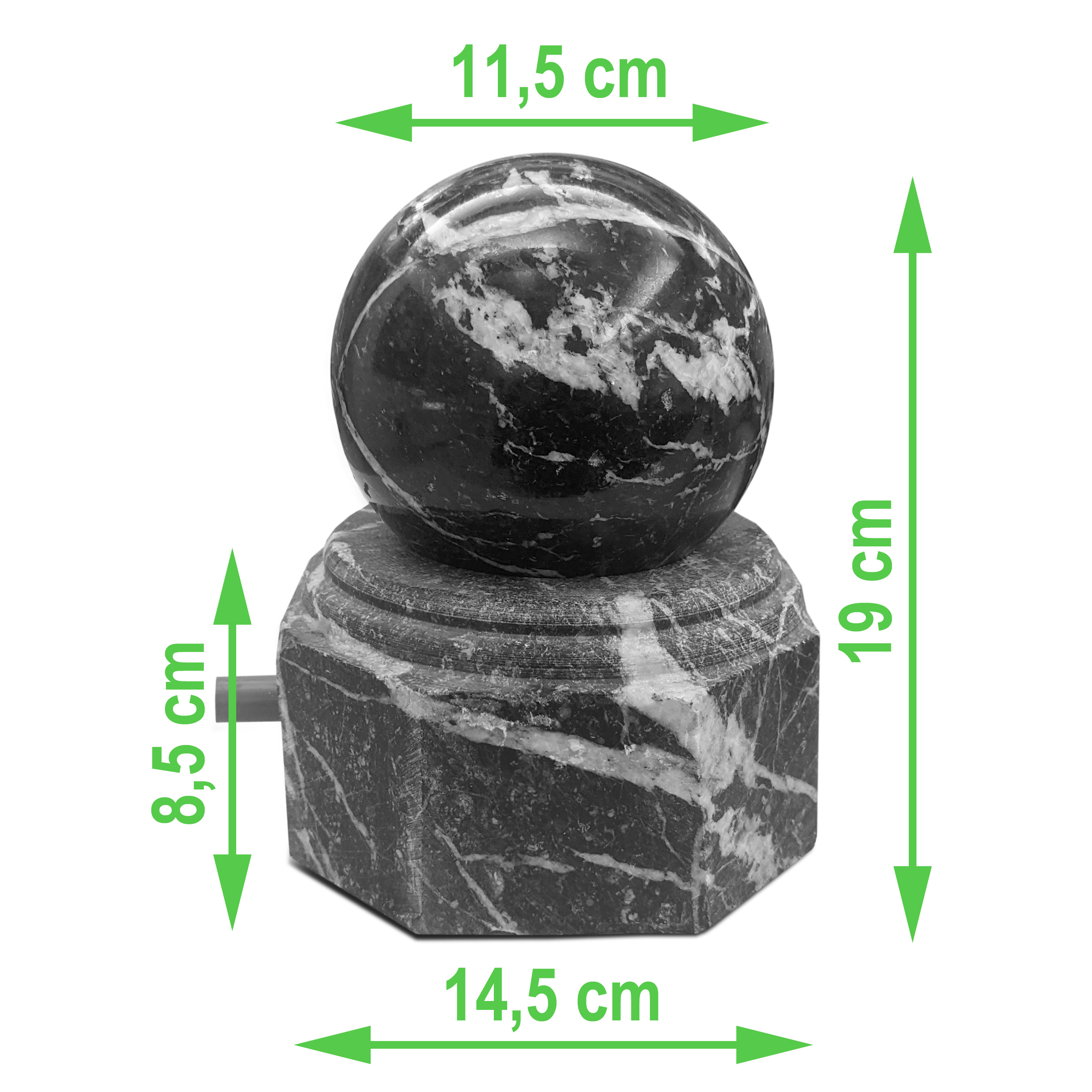 Das Wasserspiel aus Marmor ist ein eleganter Zimmerbrunnen, der mit seinem ansprechenden Design jeden Raum, Balkon oder Terrasse verschönert. Der Zimmerbrunnen ist mit einer Drehkugel ausgestattet, die sich durch das heraussprudelnde Wasser bewegt und eine beruhigende Atmosphäre schafft.